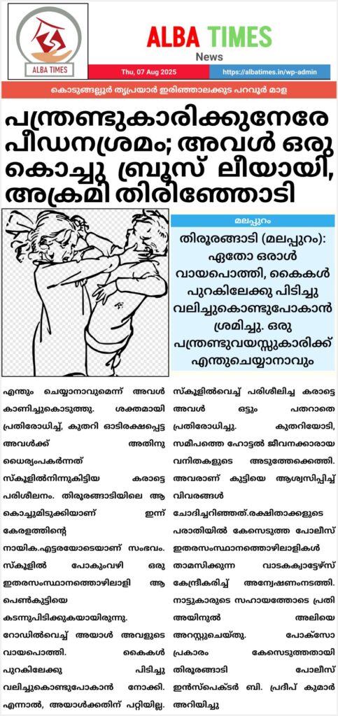 എന്തും ചെയ്യാനാവുമെന്ന് അവൾ കാണിച്ചുകൊടുത്തു. ശക്തമായി പ്രതിരോധിച്ച്, കുതറി ഓടിരക്ഷപ്പെട്ട അവൾക്ക് അതിനു ധൈര്യംപകർന്നത് സ്‌കൂളിൽനിന്നുകിട്ടിയ കരാട്ടെ പരിശീലനം. തിരൂരങ്ങാടിയിലെ ആ കൊച്ചുമിടുക്കിയാണ് ഇന്ന് കേരളത്തിന്റെ നായിക.എട്ടരയോടെയാണ് സംഭവം. സ്കൂ‌ളിൽ പോകുംവഴി ഒരു ഇതരസംസ്ഥാനത്തൊഴിലാളി ആ പെൺകുട്ടിയെ കടന്നുപിടിക്കുകയായിരുന്നു. റോഡിൽവെച്ച് അയാൾ അവളുടെ വായപൊത്തി. കൈകൾ പുറകിലേക്കു പിടിച്ചു വലിച്ചുകൊണ്ടുപോകാൻ നോക്കി. എന്നാൽ, അയാൾക്കതിന് പറ്റിയില്ല. സ്കൂ‌ളിൽവെച്ച് പരിശീലിച്ച കരാട്ടെ അവൾ ഒട്ടും പതറാതെ പ്രതിരോധിച്ചു. കുതറിയോടി, സമീപത്തെ ഹോട്ടൽ ജീവനക്കാരായ വനിതകളുടെ അടുത്തേക്കെത്തി. അവരാണ് കുട്ടിയെ ആശ്വസിപ്പിച്ച് വിവരങ്ങൾ ചോദിച്ചറിഞ്ഞത്.രക്ഷിതാക്കളുടെ പരാതിയിൽ കേസെടുത്ത പോലീസ് ഇതരസംസ്ഥാനത്തൊഴിലാളികൾ താമസിക്കുന്ന വാടകക്വാട്ടേഴ്‌സ് കേന്ദ്രീകരിച്ച് അന്വേഷണംനടത്തി. നാട്ടുകാരുടെ സഹായത്തോടെ പ്രതി അയിനുൽ അലിയെ അറസ്റ്റുചെയ്തു. പോക്സോ പ്രകാരം കേസെടുത്തതായി തിരൂരങ്ങാടി പോലീസ് ഇൻസ്പെക്ടർ ബി. പ്രദീപ് കുമാർ അറിയിച്ചു