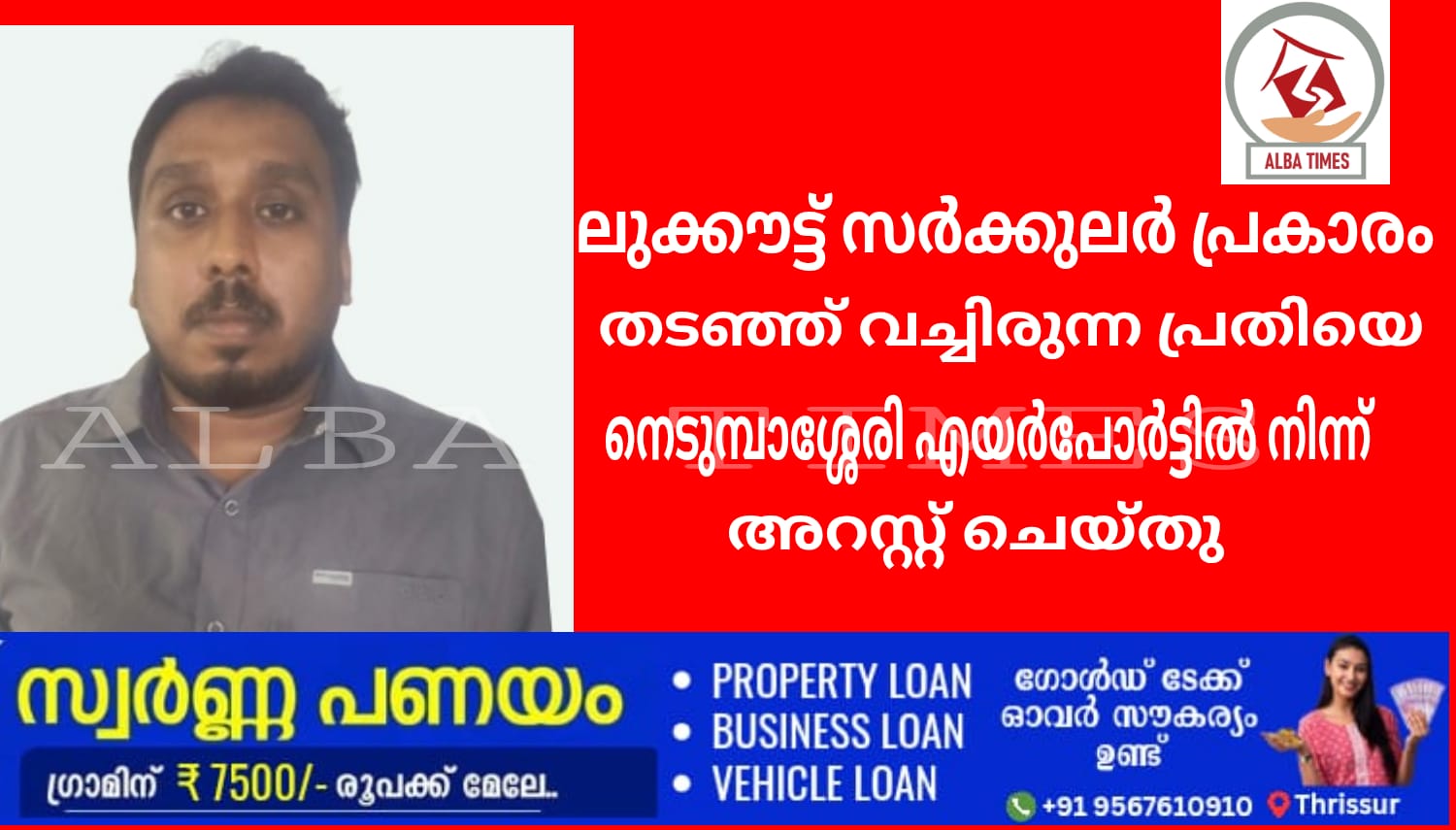 ലുക്കൗട്ട് സർക്കുലർ പ്രകാരം തടഞ്ഞ് വച്ചിരുന്ന പ്രതിയെ നെടുമ്പാശ്ശേരി എയർപോർട്ടിൽ നിന്ന് അറസ്റ്റ് ചെയ്തു